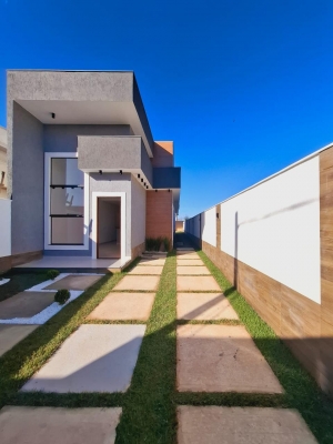 Casa de 3 quartos, sendo uma suíte, cozinha integrada à sala, área de serviço, garagem para dois carros, edícula com churrasqueira e banheiro, com box blindex, teto rebaixado em gesso, iluminação indireta na sala, janela de 3m em vidro, jardim na frente e atrás da casa. Toda em porcelanato.